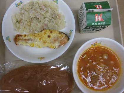 <献立名>ミルクパン 牛乳 鮭のコーンマヨ焼き