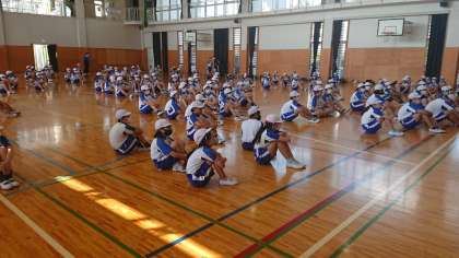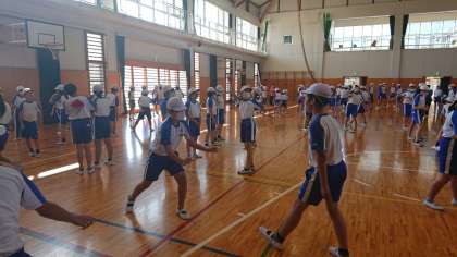 ソーラン節に向けて 公開日 2020/10/02 更新日 2020/10/02 6年生 今日の5時間目は,5年生と合同の体育でした。実行委員を中心に,みんなでソーラン節を踊りました。6年生は一生懸命に5年生に教えることができました。