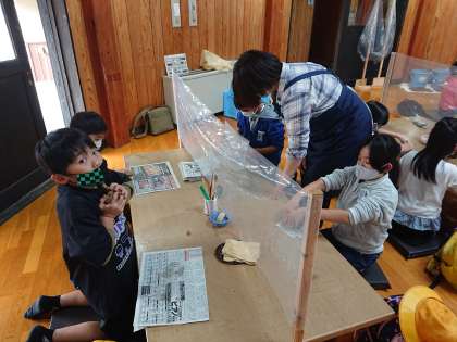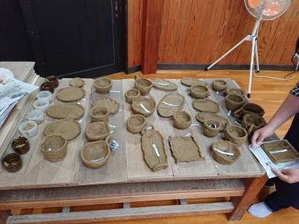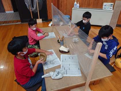 笠間工芸の丘の方から作り方を教わり、子供たちの笠間焼作りが始まりました。工夫をこらした力作ぞろいです。焼き上がりが楽しみです。