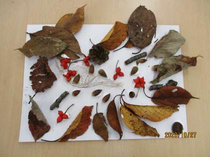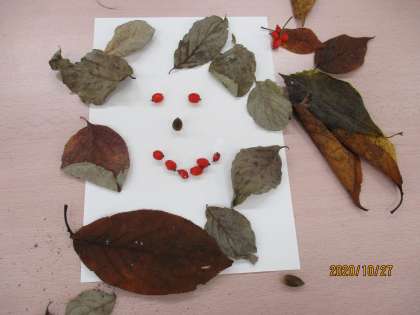 合同学習 秋をさがそう 公開日 2020/10/27 更新日 2020/10/27 特別支援 先週、校庭や西坂で、落ち葉や木の実拾いをしました。 今日は、それを材料にして、作品作りをしました。 想像力を働かせて、人の顔や壁飾りを作ることができました。