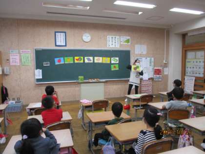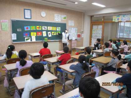 外国語活動では,フルーツの名前を英語で覚えながら,○×ゲームを楽しみました。