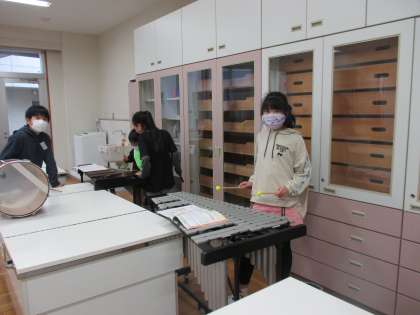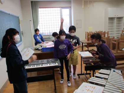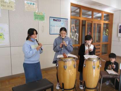 リコーダー、木琴、鉄琴、打楽器、低音を電子ピアノで演奏しています。