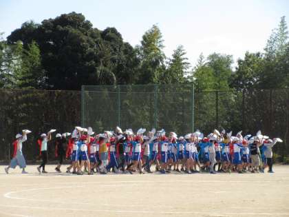 取小Go!Go!オリンピック練習 公開日 2020/10/31 更新日 2020/10/31 3年生 今日は取小「Go!Go!オリンピック」に向けて4年生との練習でした。 花笠音頭に始まり,徒競走,そして綱引きを練習しました。 花笠音頭は鈴や背中につけるリボンなどを身につけて踊ります。身につけてみると,本番に向けての気持ちが高まったのか,踊りに磨きがかかっていました。