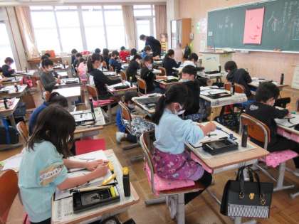 5時間目の様子 3年生 公開日 2020/11/12 更新日 2020/11/12 3年生 1組は書道で真剣に「入」の字を練習していました。2組は音楽で自分で作ったリズムを楽しそうに手拍子うちをしていました
