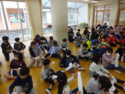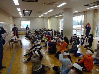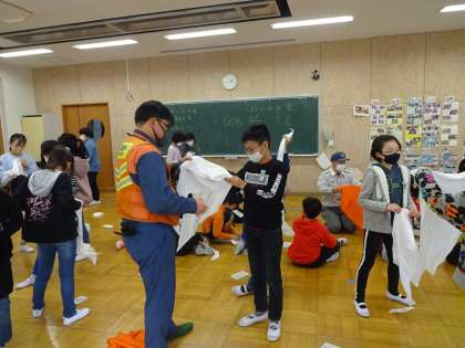 応急処置の体験 公開日 2020/12/13 更新日 2020/12/13 4年生 昨日の地域防災訓練では,消防署,消防団員の方々の指導を受けながら,三角巾を使った応急処置の仕方を学びました。止血法や固定法を教えていただき,子供たちも熱心に取り組んでいました。 振り返りでは,家族や友達がケガをしたときに,手当してあげたいという感想が出てきました。生活の中で生かせるといいです。