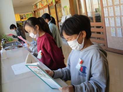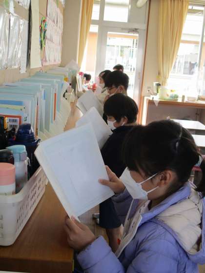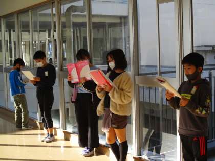 4年生 国語 公開日 2022/12/19 更新日 2022/12/19 4年生 聞いてほしいな心に残っている出来事の学習では、聞き手に自分の気持ちが伝わるように工夫して読む学習をしました。自分が書いた原稿をどのようにして読めばよいのか、工夫点も書き込み、各自読む練習をしています。