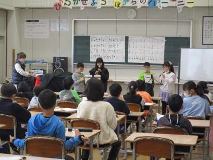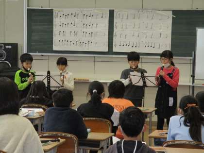 4年生 音楽 公開日 2023/01/17 更新日 2023/01/17 4年生 リコーダーアンサンブルの発表がありました。4人組で気持ちを込めて演奏しました。感染対策もしっかりと行いながら練習した成果を発揮できました。
