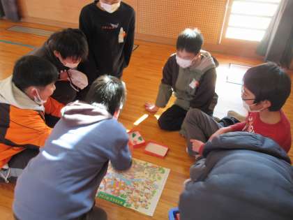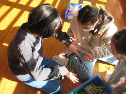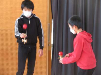 学校がはじまってすぐに、お正月遊びをしました。1組と2組合同で、コマを回したり、けん玉をしたりして、楽しく遊ぶことができました。