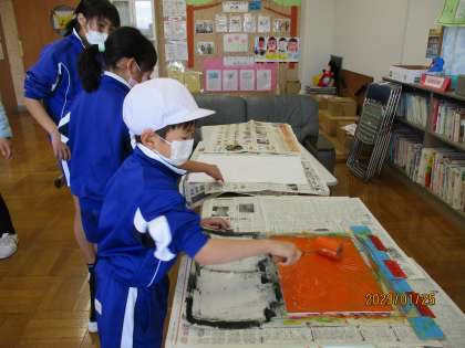次に、グループで各教室に移動し、印刷をしました。それぞれローラーやバレンをうまく使ってできました。紙を合わせる人、バレンでこする人など、交代しながら協力してやっていました。今後しばらく、印刷が続きます。