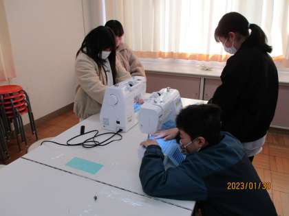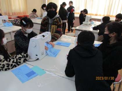 5年生では今、家庭科でミシンを使っています。糸のつけ方も慣れてきて、返しぬいや直角にぬうこともできるようになってきました。来週はいよいよエプロン作りに入ります。