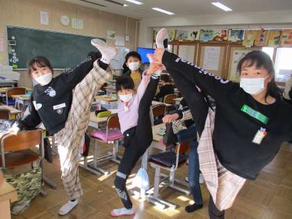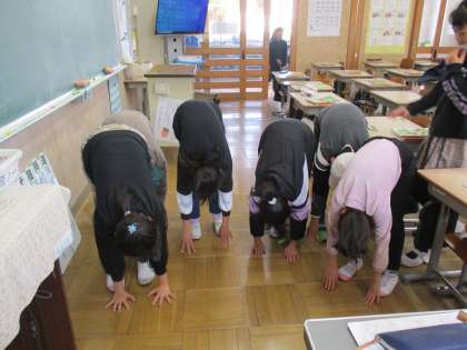 休み時間の様子です。雨天のため外で遊べない時には、柔軟体操をして遊ぶ時もあります。みんな体が柔らかいです。