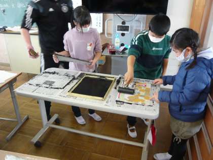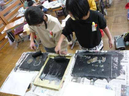 3年生 図工の時間 公開日 2023/02/03 更新日 2023/02/03 3年生 図工の時間に作製している版画を、いよいよ刷りはじめました。ローラーを使ってインクを付けるのが初めて!という子がほとんどです。どんな風に刷り上がるのかな?とドキドキしながら取り組んでいました。