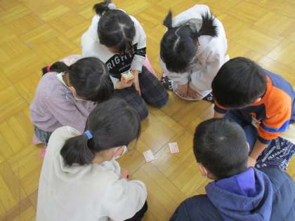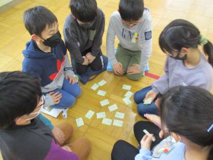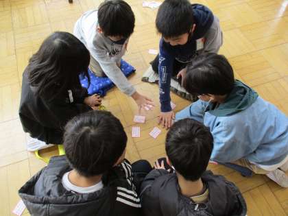 国語の授業で、百人一首の学習をしています。今日は、6人グループになって百人一首をしてみました。読み手は難しかったようですが、音程に合わせて一生懸命に読んでいました。また、字札が少なくなるとより一層集中している姿が印象的でした。