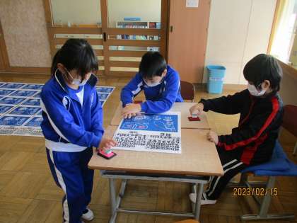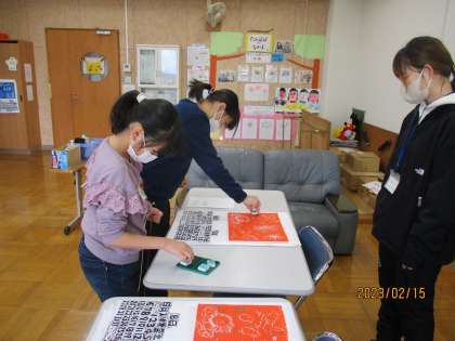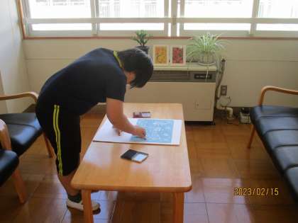 2月15日の合同学習の1時間目は、版画のグループに分かれて、自分の作品の横に名前のはんこを押しました。1枚ずつ丁寧に押しました。交代しながらやり、うまく押せると満足そうな表情をしていました。後は綴じ込みで完成します。仕上がりが楽しみです。