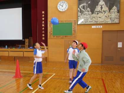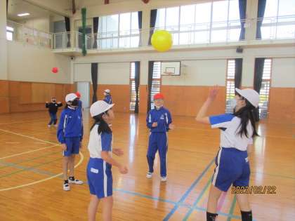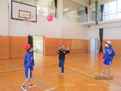 運動では2番目に、風船バレーをやりました。3、4人で丸くなって風船を落とさないようにパスをしました。風船をよく見て打つことができました。相手がとれるように考えながら、楽しく取り組んでいました。