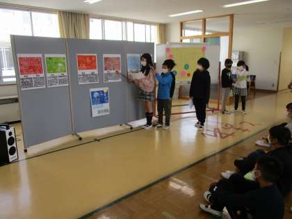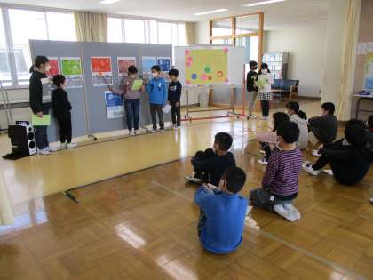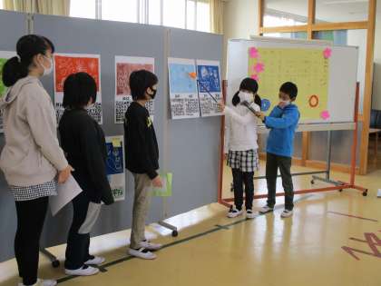 3月8日に版画カレンダー完成パーティーをやりました。自分の彫った版画のお気に入りのところや、よくできたところ、苦労したところなど一人一人発表しました。どの子もしっかり発表できました。また、友達の発表をよく聞くことができました。素敵なカレンダーが完成して、みんな嬉しそうでした。4・5年生が実行委員となり、司会をしたり、プログラムを作ったりすることもできました。頑張りました。