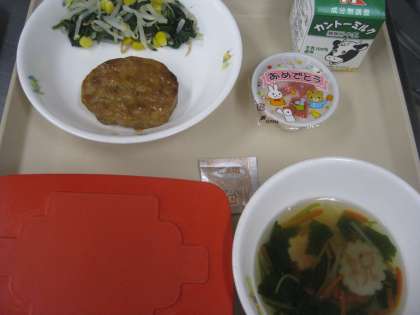 今日の献立(体みがき) 公開日 2023/03/17 更新日 2023/03/17 子どもたちの活動 3月16日(木)体みがき <献立名>赤飯 牛乳 照り焼きハンバーグ ほうれんそうのサラダ 桜麩のすまし汁 デザート 卒業お祝い献立でした。