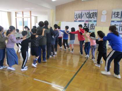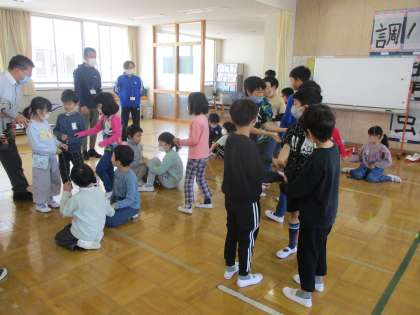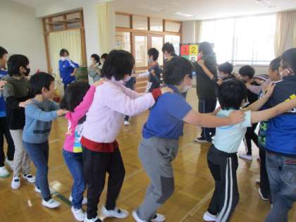 始めに、ジャンケン列車をやりました。どんどん列が長くなるにつれ、さらに楽しさが増し、誰が勝つのか楽しみにやっていました。一つの列になって音楽に合わせて一周しました。みんな笑顔でした。