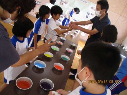 紙を折った後は、角に絵の具をつけました。どの色にするか迷いながら、自分の好きな色を選んで色をつけていました。