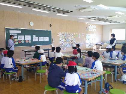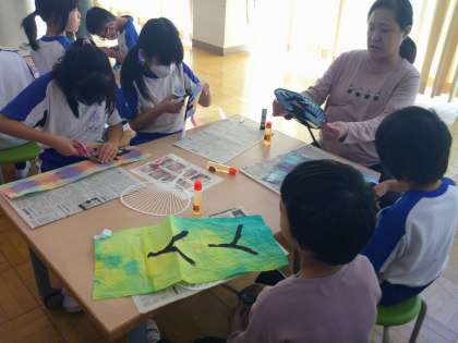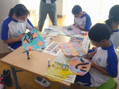 10月17日の合同学習では、1時間目に「マイうちわ」作りを進めました。初めに説明を聞いた後、字を書いた折り染めの紙を、はさみで注意深く切り取りました。どの子も集中して取り組みました。学年ごとにめあてを決めて、取り組みました。はさみの扱いが上手になってきました。