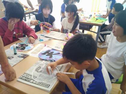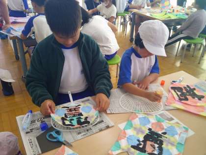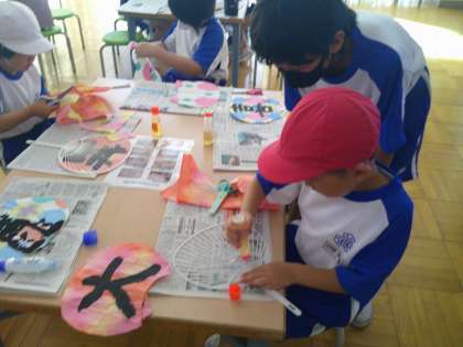 折り染めの紙を切り取ったら、うちわにのりで貼りつけていきます。上級生が、のりの塗り方を下級生に教える場面も見られました。両面とも貼り付けて、うちわが完成すると、どの子も自分のうちわに見入って、嬉しそうな表情でした。