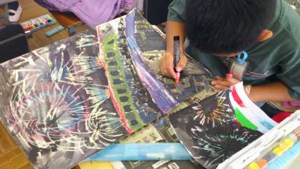 4年生では,花火の絵を描いています。絵の具,ロウソク,墨,ポスカなど様々な用具を使って描いています。自分の満足いく作品を作るために,一生懸命取り組んでいます。