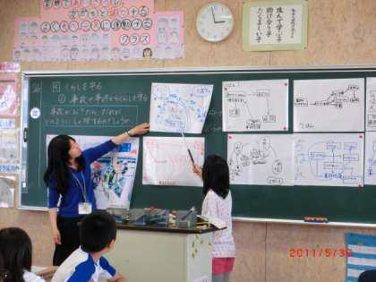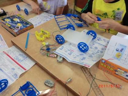理科では電気の勉強をしています。豆電球が明るく光ったり,モーターが速く回る理由を調べました。そのあと,モーターで風車を回し,車を動かしました。