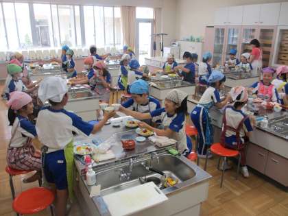 5年生は,5月24日に1組,29日に2組が,生まれて初めての調理実習を行いました。