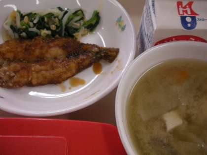 「献立」麦ごはん,牛乳,いわしのかば焼き,ほうれん草のなめ茸和え,かみなり汁