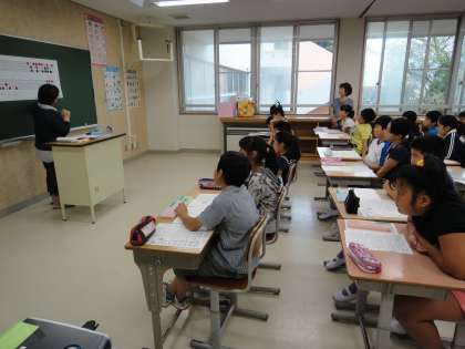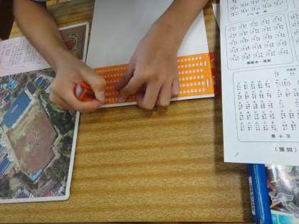5年生は総合学習でクラスごとに点字体験を行いました。はじめに五十音表を使ってひらがなや数字の表し方を学習しました。その後,実際に紙に一文字ずつ点字を打っていきました。駅の券売機や道路の点字ブロックなどを見たことはあっても,点字を打ったことはない子が多く,次々に新しい文字に挑戦していました。