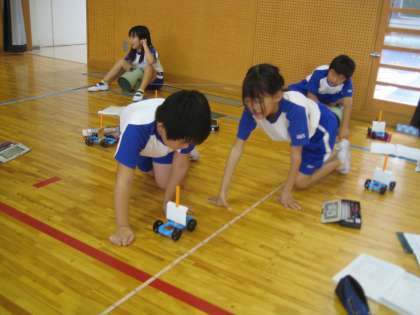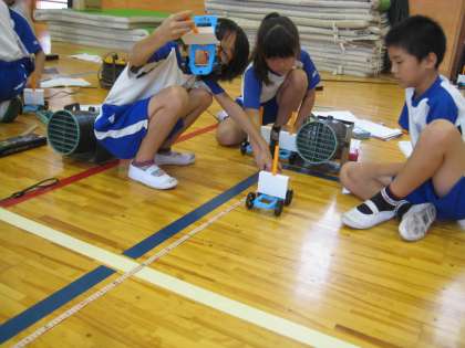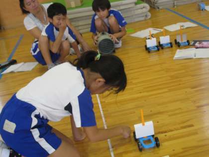理科の「風とゴムのはたらきをしらべよう」では、風で動く車を作り、風の強さによって車の動きがどう変わるかを実験しました。3年生にとってはこれがはじめての実験です。距離や速さが予想通りだった子も、そうでない子も、きらきらと目を輝かせながら、しっかり自分の目で確かめていました。