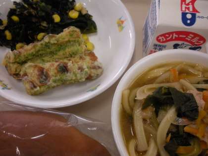 <献立>煮込みうどん,牛乳,竹輪の磯辺揚げ,わかめの煮浸し,黒パン
