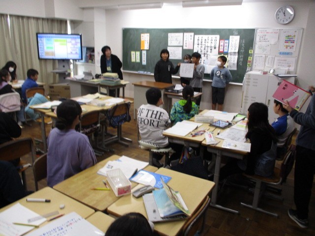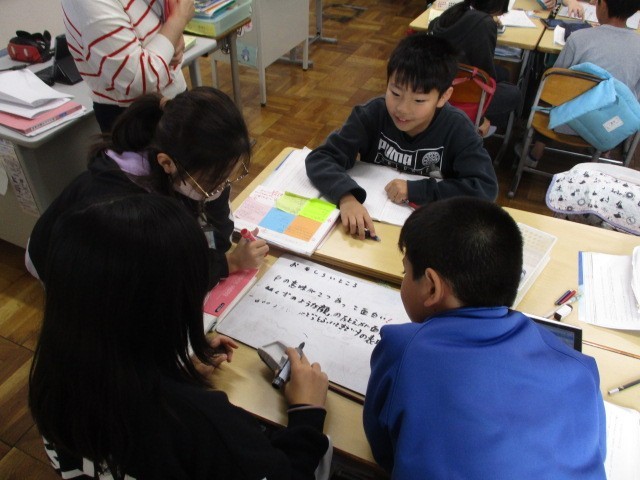 今日の国語は宮沢賢治の名作「注文の多い料理店」の授業です。これまでの読みをもとに、物語をおもしろくしている表現の工夫を見つけて紹介し合います。2つの意味をもつ言葉や様子や音、色彩、たとえ、繰り返しなどの視点から表現のおもしろさをグループで話し合いました。子供たちは、どうしてその表現がおもしろいのか、根拠を言いながら楽しそうに話し合っていました。グループごとの伝え合いも積極的にできました。