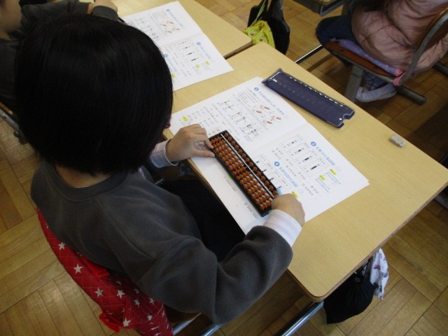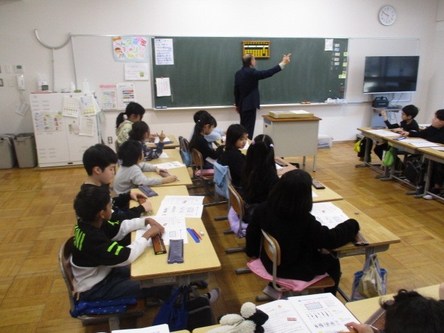 今日3年生は、茨城県珠算教育団体連合会から講師の先生をお招きして、そろばんの指導をしていただきました。初めて触るそろばんに少し戸惑いを感じながらも、興味をもって一生懸命取り組んでいました。数の表し方がわかり、簡単な足し算や引き算ができると、子供たちは満面の笑みを浮かべていました。位取り記数法の理解にも大いに役立つ貴重な体験でした。