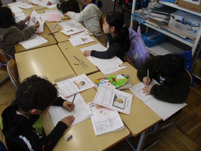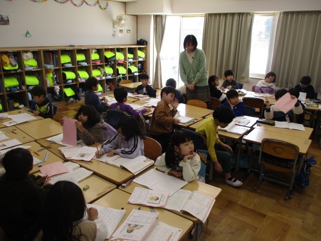 今日の国語は、1年間、生活面で頑張ったことの振り返りです。頑張ったことを文にしていきました。「2学期のめあて」を参考にして、「あいさつがよくできました。」「おともだちとなかよくできました。」「わすれものをしませんでした。」などなど、自分の頑張ったことを一生懸命ノートに書き出していました。「頑張ったね。」「すごいね。」と声をかけると、笑顔いっぱい、さらに頑張ったことを書き出していきました。成長著しい子供たちです。