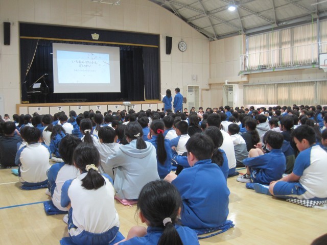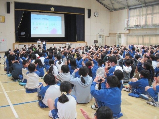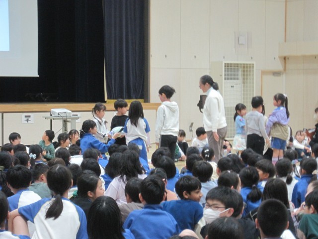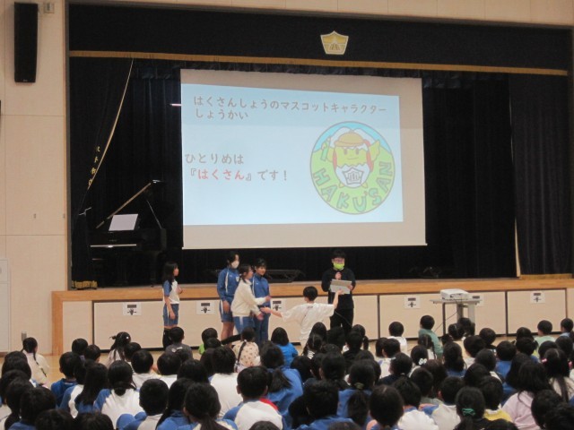 1年生を迎える会がありました。1年生は、たくさんの拍手で迎えられ、6年生と手をつないで入場しました。白山小の学校紹介やクイズをみんなで楽しんで、2年生からはアサガオの種と手作りのメダルのプレゼントをもらいました。これから、たくさんのお兄さんお姉さんとも仲良くなって楽しい学校生活を送っていきましょう。また、迎える会の準備や運営をした委員会の6年生たちの堂々とした進行がとてもすばらしかったです。いろいろな役割を担った各学年の代表の子たちもがんばりました。