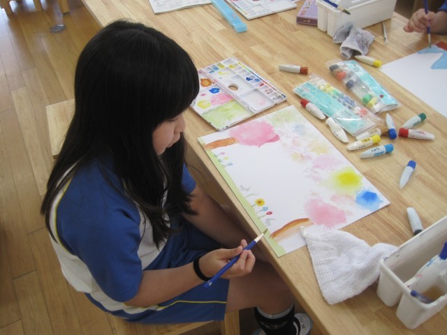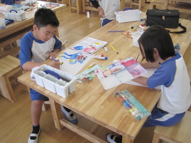 絵の具で好きな絵を描きました。絵の具に混ぜる水の量を変えたり筆の使い方や動かし方を工夫したりして、思い思いに楽しく描いていました。