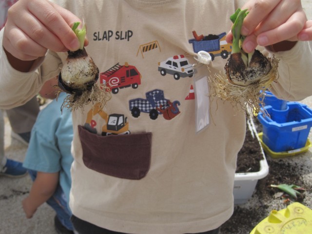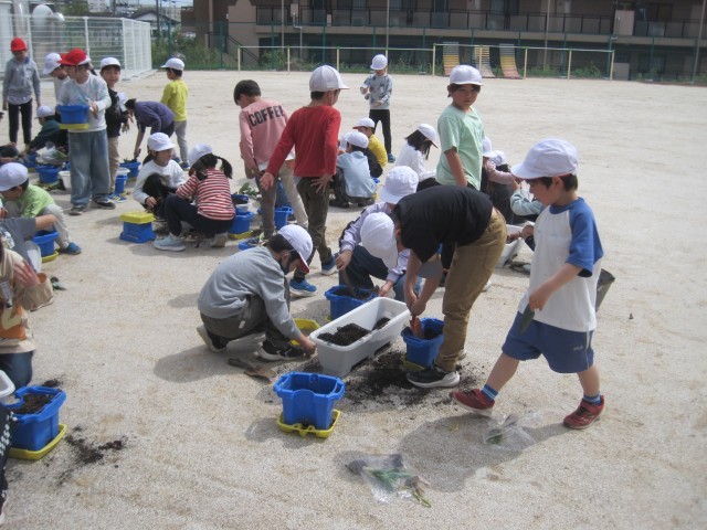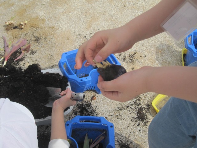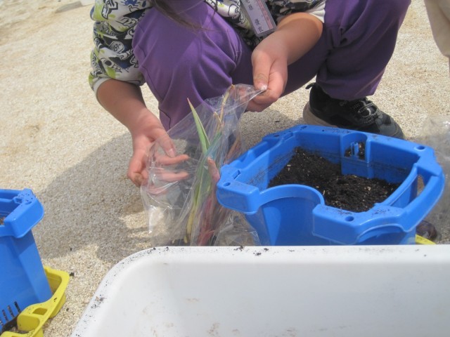 生活科の時間に、植木鉢の片付けをしました。1年生で育てたチューリップも時季が終わり、今度はミニトマトを育てるために片付けをしました。球根を丁寧に土から取り出し、袋に大事に入れました。球根はお家へ持ち帰りましたので、今度はお家でまた花を咲かせてください。
