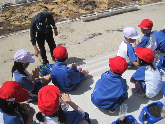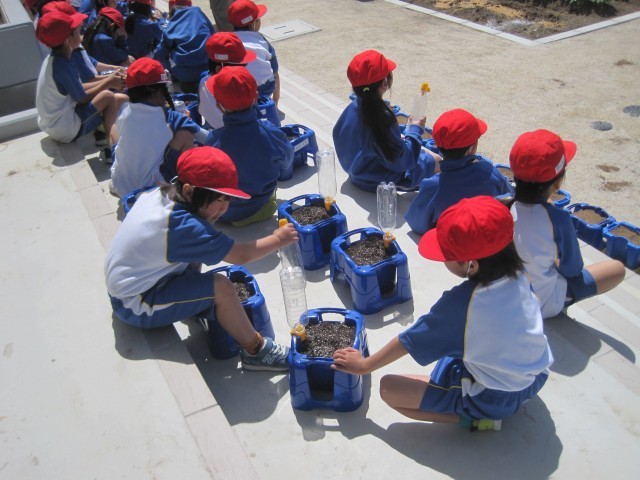 生活科の時間に、アサガオの種をまきました。アサガオ先生に来てもらって、種のまき方を教わりました。これから大事に育てていきます。芽が出るのが楽しみですね。