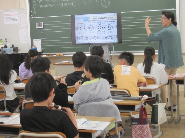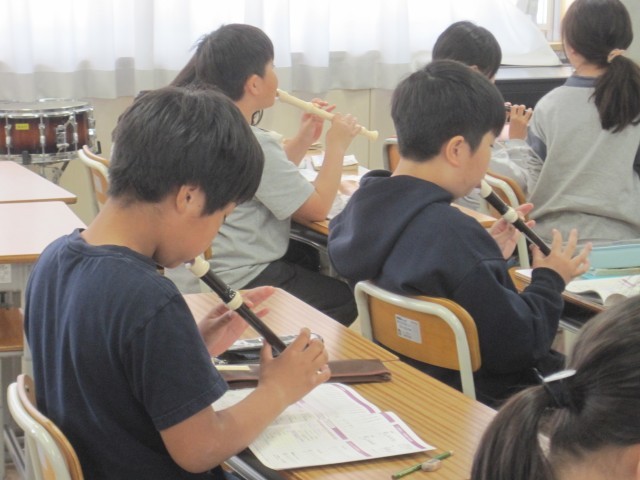 音楽の時間は、校歌をはじめいろいろな歌を歌うことからスタートします。声量があり、素敵な声を響かせて歌っています。その後、「リボンのおどり」をリコーダーで演奏するために階名を確認しました。階名を書いているときに、子供たちから「リコーダーの練習をしていいですか?」の声があがりました。自分から進んで取り組む姿勢がすばらしいです。