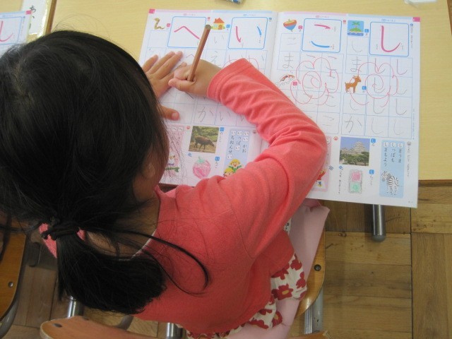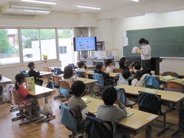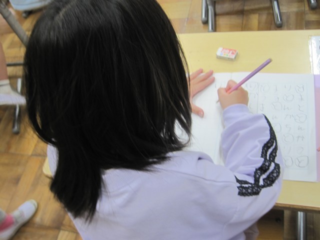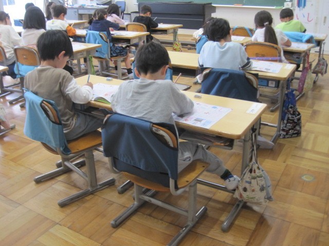 1年生も少しずつ授業に慣れてきて、がんばっています。国語では、ひらがなの練習で、友達のノートを見合って言葉集めの参考にしたり、絵本を読んでもらって、「おもしろかった!」と笑顔になったり、1組も2組も楽しく学習しています。