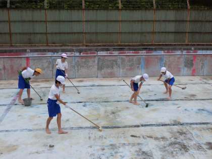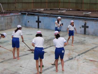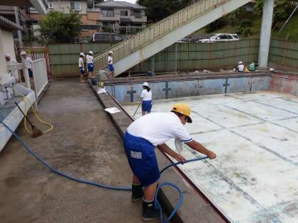 周りの落ち葉拾いや,トイレ清掃,プールの中をブラシで磨くなどみんな一所懸命に取り組んでいました。
