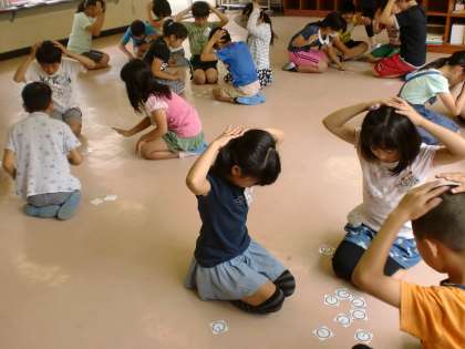 今月の英語活動は,「今何時」です。グループに分かれてカルタとりをしました。みんなイブ先生の英語が聞こえるまでちゃんと手を頭にのせて待っています。楽しくゲームしながら「何時」という英語に触れることができました。