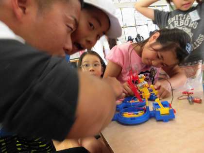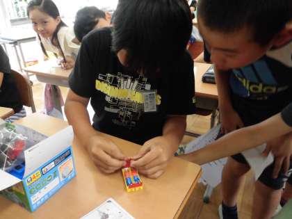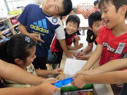 理科の実験で電気の働きを学習します。電池を使って電球を光らせたり,モーターを回したりしています。