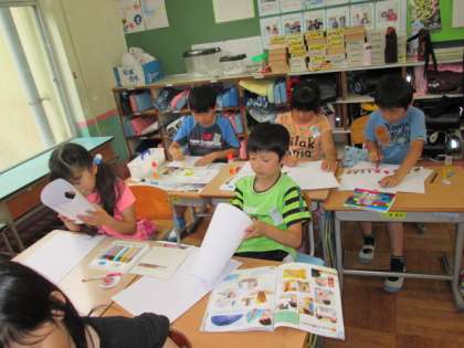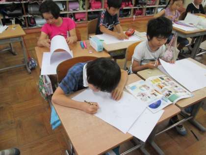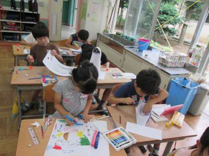 図工の学習「立ち上がった絵のせかい」で,絵を立ち上げてあらわしました。紙を折ったり丸めたりして立たせ,立たせた紙に絵を描き,いろいろな世界がどんどん広がっていきました。「ここから覗くとね・・」と紙に穴をあけたり,「切り抜いた紙を切ったらね・・」と形の見え方のおもしろさを楽しんだりしながら作っていました。