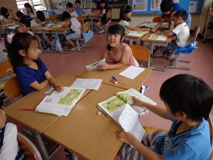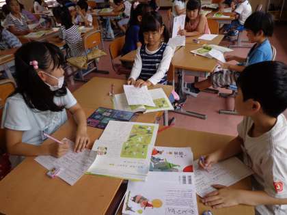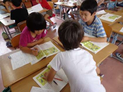 国語で犬の特徴を聞いて捜す学習をしました。大きさや色,しっぽや耳の特徴を聞いて,メモをして捜します。グループになり,順番で役割を交代して,捜しました。とても上手に話し合うことができました。
