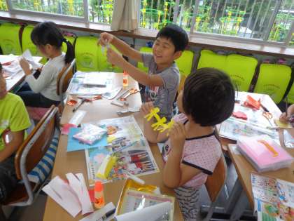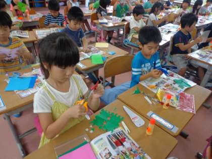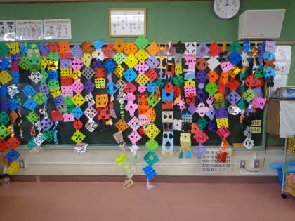 折り紙を折ったり重ねたりしたものをはさみを使って切って,すてきな飾りを作りました。紙を回してはさみを上手に動かして,好きな形に切り抜きます。開いたらどんな形ができているかな?「うわあ!やった!!」「きれいに切れたよ!」と,嬉しそうな子どもたちの声があちらこちらから聞こえてきました。