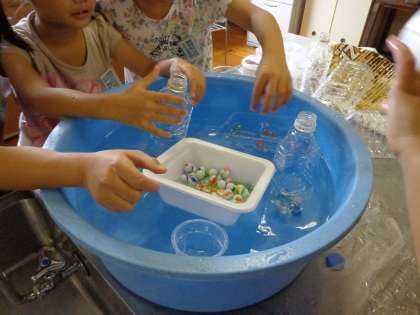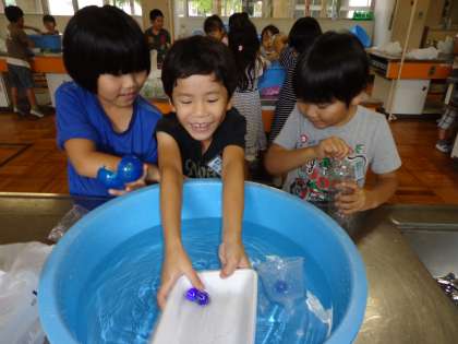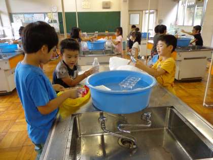図画工作科では水に浮かぶ飾りを作ります。今日は家庭科室で,持ってきた物を水に浮かべてみました。子供たちは水が大好きなので,張り切って活動していました。