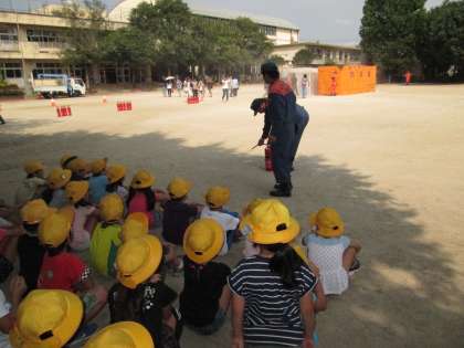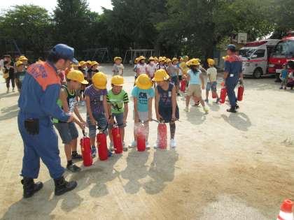 消火器を初めて持つ子もいて,わくわくした様子で取り組んでいました。