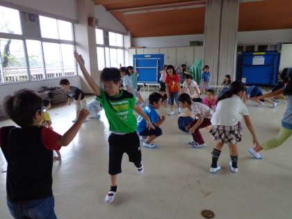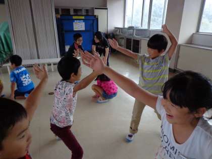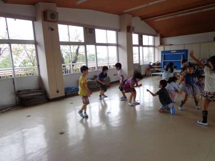 雨なので,多目的室2で進化じゃんけんをしました。じゃんけんは体力をつけるために体全体で行いました。とても楽しそうでした。